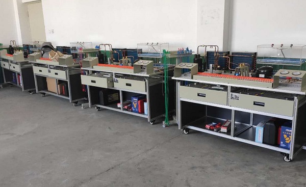 系統(tǒng)由兩部分組成,分別為:分體式熱泵空調(diào)和直冷電冰箱,分體空調(diào)可進(jìn)行制冷、制熱、除濕、自動工作模式功能,直冷式電冰箱可進(jìn)行冷藏、冷凍等功能,涵蓋了制冷專業(yè)中所涉及的安裝、管路設(shè)計焊接技術(shù)、接線、保壓、檢漏、抽真空、充注制冷劑、制冷劑回收、運(yùn)行調(diào)試,控制電路故障考核等。本裝置應(yīng)適合機(jī)電、動力工程類專業(yè)的實訓(xùn),適合制冷及相關(guān)專業(yè)的中級、高級工的技能鑒定及考核。