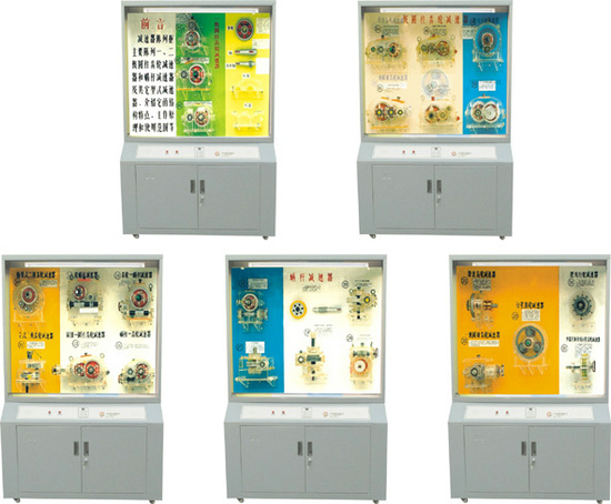 減速器陳列柜-是根據大中專院校,職業(yè)學校的教學大綱設計的機械陳列柜,《減速器》電化教學設備。減速器陳列柜共5個柜25種減速器及1個控制臺,用CD解說遙控控制,聲控同步進行演示機械模型,加強對機械專業(yè)的學生的理論學習,使用范圍增強認識,加深理解,是機械專業(yè)系不可缺少的理想教具設備。
