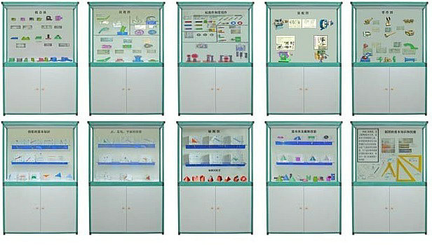 | 第一柜 制圖基本知識和技能 | 前言:1、尺寸標注;2、幅面;3、圖線;4、字體;5、線段與線框的意義;6、標題欄格式;7、圓錐、小圓錐、圓形量角器、鉛筆、橡皮擦、450三角板(二種)、600三角板(二種)、曲線板、多孔模板、丁字尺等。(丁字尺的使用;鉛筆的使用;圓錐的使用方法;分錐的使用方法;曲線板的使用方法;丁字尺和和三角板組合使用方法等由多媒體軟件講解演示) | 本套陳列柜采用121件動畫圖象配合陳列柜上的內(nèi)容在電腦上演示各種模型特點,如制圖工具的使用、投影產(chǎn)生過程、投影作圖步驟、裝配功能等、生動形象。 |