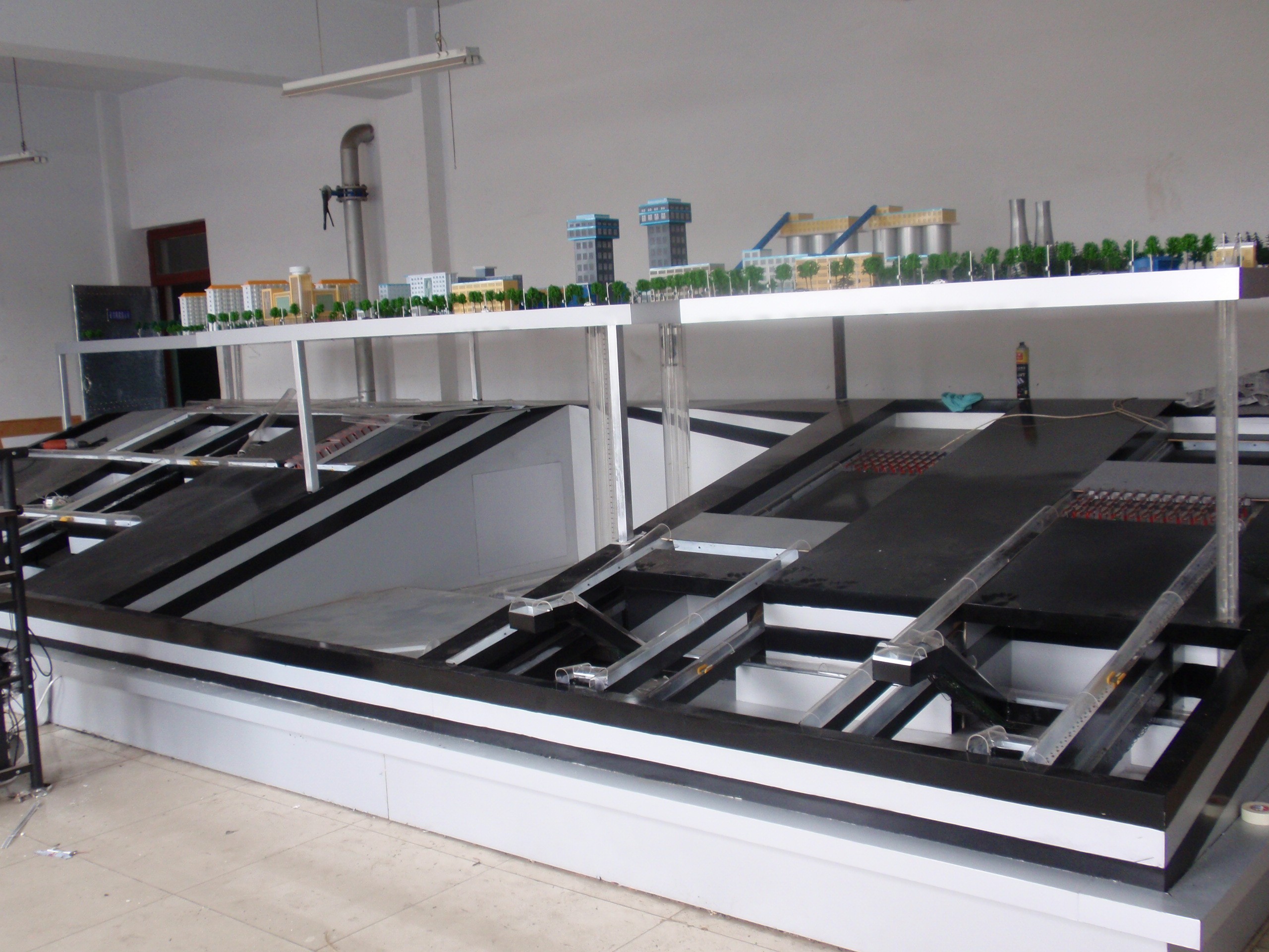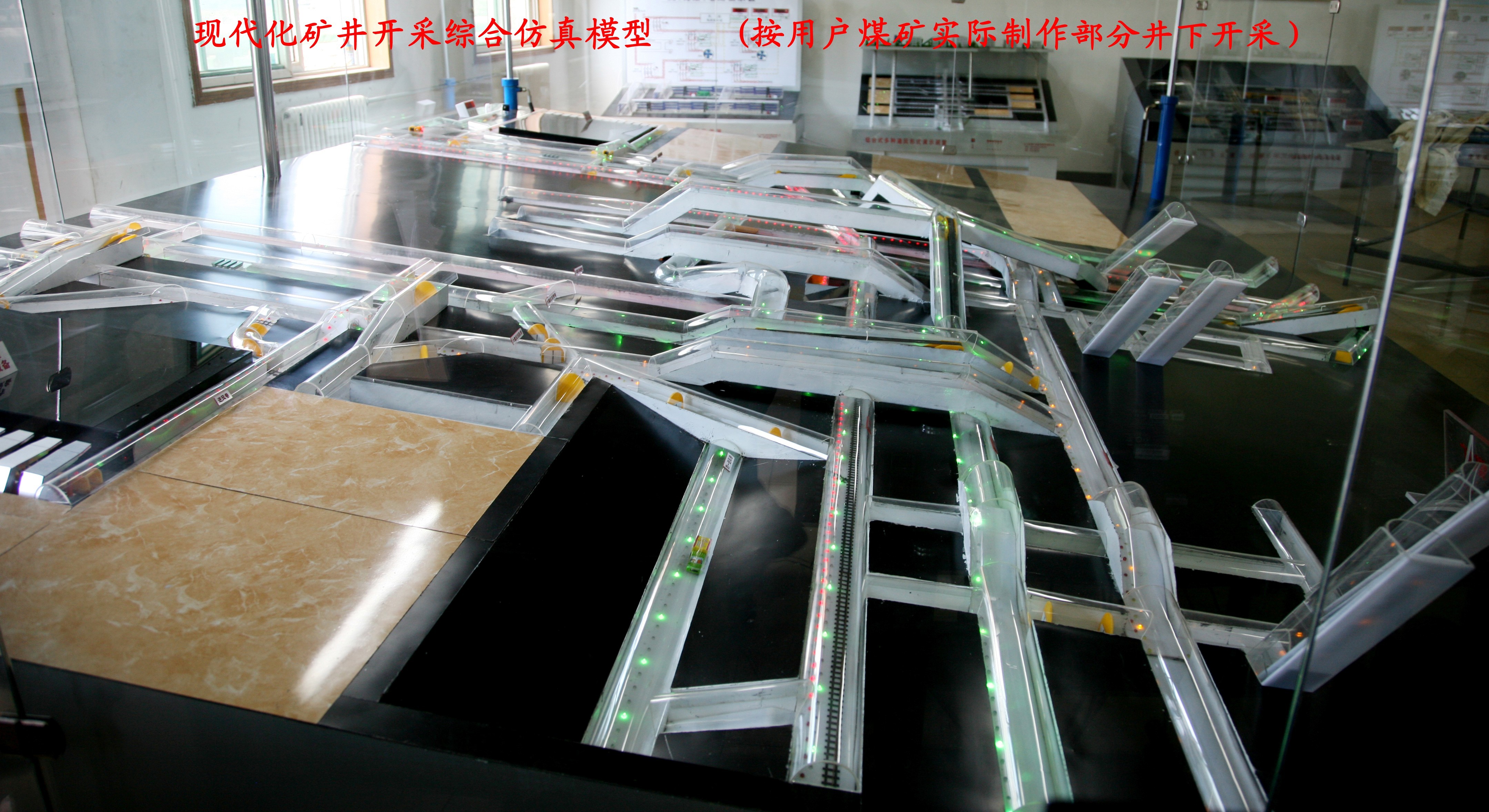 該模型使用井上、下對照方式,能夠全面、系統(tǒng)模擬我國典型現(xiàn)代化煤礦的井上地面生產(chǎn)建筑布局和通風(fēng)、壓氣、排水、提升、運(yùn)輸、轉(zhuǎn)載、供電、調(diào)度等機(jī)電設(shè)備的生產(chǎn)運(yùn)行系統(tǒng)。具有完整的地面工業(yè)廣場和井下生產(chǎn)系統(tǒng)的開拓系統(tǒng)及齊全的采煤法(走向長壁和傾斜采煤法),左翼布置綜采采區(qū),右翼布置高檔普采工作面,多種通風(fēng)形式。電動燈光演示其生產(chǎn)工藝過程,能反映全礦通風(fēng)系統(tǒng),體現(xiàn)掘進(jìn)通風(fēng)與安全設(shè)施(三專兩閉鎖),顯示瓦斯監(jiān)測系統(tǒng)、CH4濃度超過1.0時開始報警,超過1.5時開始斷電,并模擬演示礦井災(zāi)變(如火災(zāi)或瓦斯爆炸)發(fā)生時,整個通風(fēng)系統(tǒng)發(fā)生連鎖反應(yīng)。多媒體可視化系統(tǒng)。可顯示主要工作點(diǎn)、轉(zhuǎn)載點(diǎn)的工作狀況,模擬生產(chǎn)指揮中心監(jiān)測監(jiān)控。展現(xiàn)了我國常用的各種采煤方法。并采用多種剖切手法,展現(xiàn)出各巷道之間的空間立體關(guān)系。在計算機(jī)與PLC相結(jié)合的控制手段下,能夠適應(yīng)不同專業(yè)的講課需要。為了滿足視覺效果更方便于教學(xué)同,地面工業(yè)廣場采用可升降系統(tǒng)。