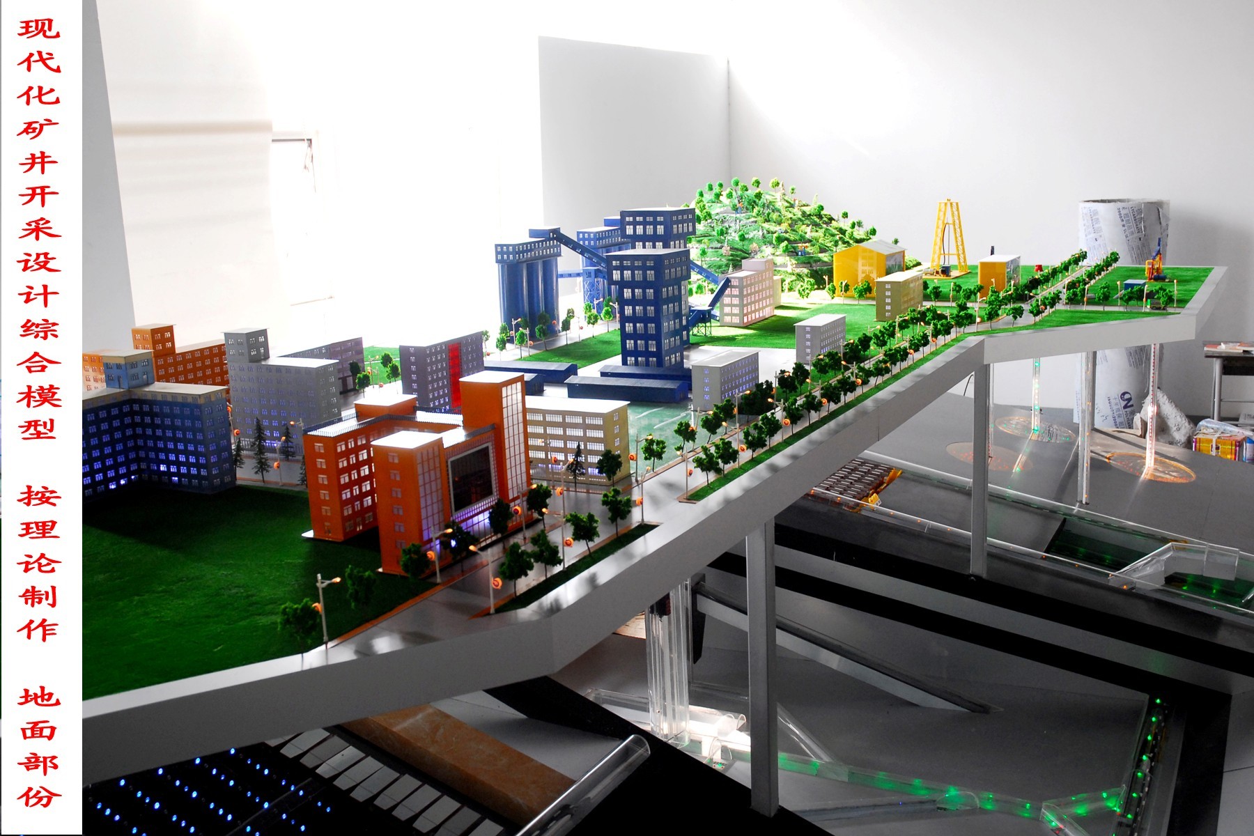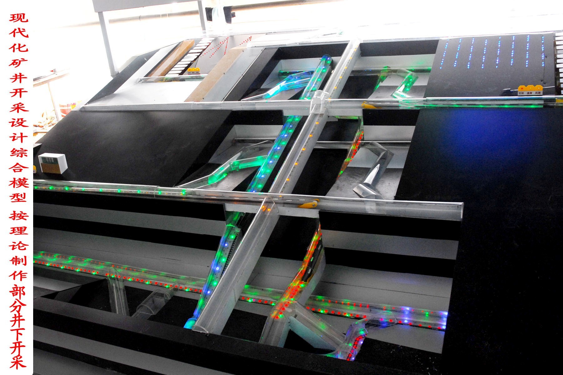 該模型由地面、井下生產(chǎn)系統(tǒng)組成。能夠完整的顯示出采區(qū)巷道布置系統(tǒng)(即準(zhǔn)備巷道、回采巷道)、采區(qū)生產(chǎn)系統(tǒng)。立體顯示出井下各巷道立體布局及各巖層空間位置。光、電模擬顯示運(yùn)煤系統(tǒng)、通風(fēng)系統(tǒng)和運(yùn)料系統(tǒng)。