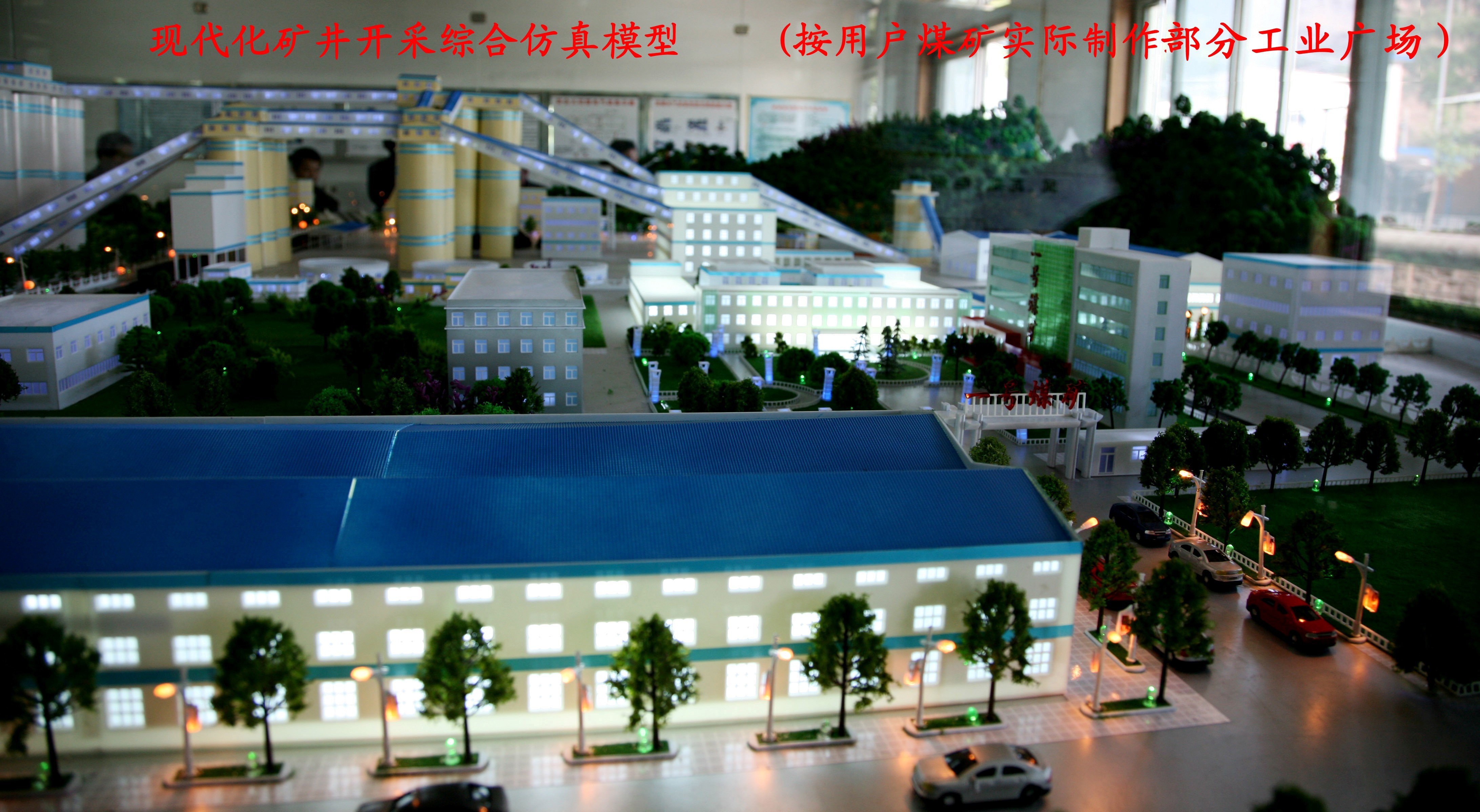 地面以本礦工業(yè)廣場實(shí)際情況按比例仿真制作。其內(nèi)容主要有:1、主井皮帶走廊;2、副井絞車房;3、運(yùn)煤皮帶走廊;4、行政辦公大樓;5、福利樓;6、機(jī)修車間;7、鐵路;8、煤倉;9、裝車站;10、煤場;11、倉庫;12、風(fēng)機(jī)房;13、救護(hù)隊;14、職工宿舍;15、生活小區(qū);16、坑口發(fā)電廠;17、鍋爐房;18、電控中心;19、安培中心;20、配電裝置;21、冷卻塔;22、選煤廠;23、道路;24、地形、地貌、樹木、草坪等。