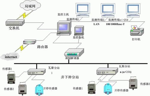 設(shè)備包括:系統(tǒng)軟件、監(jiān)測分站、傳感器、傳輸線路、調(diào)制器、打印機(jī)、監(jiān)控主機(jī)、監(jiān)控終端、交換機(jī)、路油器等