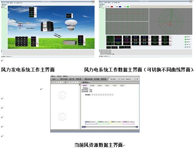 顯示內(nèi)容:蓄電池電壓、風(fēng)機(jī)電壓、光伏電壓、風(fēng)機(jī)電流、光伏電流、風(fēng)機(jī)功率、光伏功率,能量模擬圖,當(dāng)前風(fēng)速(米/秒),當(dāng)前風(fēng)向(度),當(dāng)前風(fēng)力資源平估。
