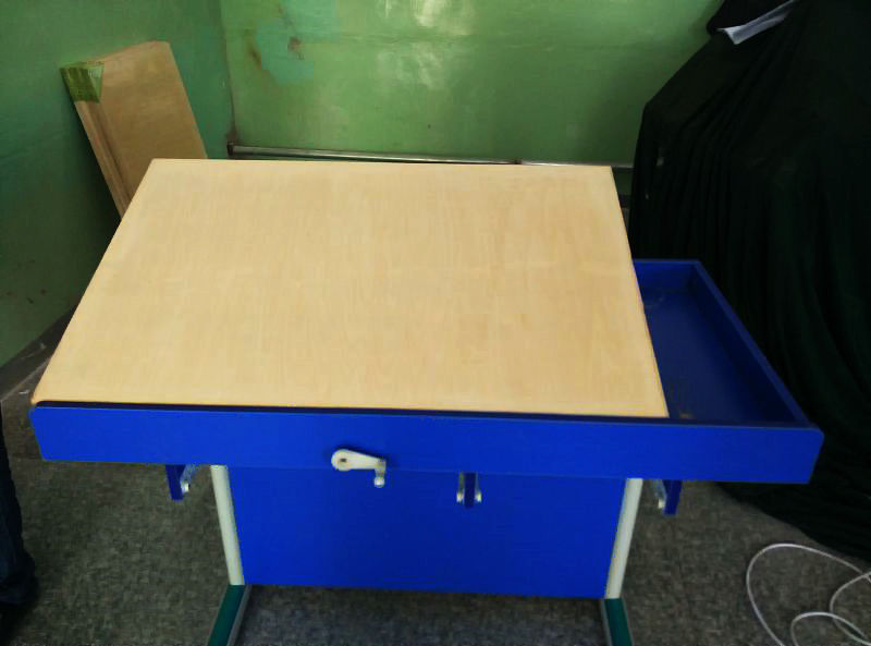 鋼木結(jié)構(gòu)桌體材料選用16mm厚優(yōu)質(zhì)雙貼面三聚胺板,桌體板截面選用優(yōu)質(zhì)PVC封邊,經(jīng)由自動(dòng)封邊機(jī)加熱180攝氏度膠封。桌體下部為左右兩邊為鋼質(zhì)支撐架連接,結(jié)實(shí)美觀; 繪圖板為高級(jí)90*60mm一號(hào)繪圖板;凳子為鋼塑結(jié)構(gòu)圓凳;