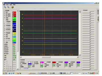 2)、軟件控制,能在線控制系統(tǒng)的溫度,讀取機組在最佳溫度系統(tǒng)制冷冷媒的流量開度數(shù),調(diào)整制冷機組的過熱度,過冷度。該文本顯示界面的左側(cè),以文本的形式實時顯示當(dāng)前機組的運行數(shù)據(jù)。在界面右側(cè)的上半部分,是對通訊信息的顯示,包括通訊角色及通訊端口的設(shè)定值以及對當(dāng)前通訊狀態(tài)的顯示。在界面右側(cè)的下半部分"數(shù)據(jù)信息"中,顯示當(dāng)前接收到哪種數(shù)據(jù)幀、接收到的數(shù)據(jù)幀的地址、等信息。具有上位機調(diào)節(jié)的線上和手動調(diào)節(jié)功能: