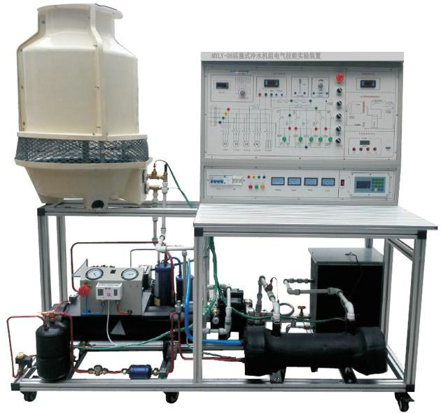 活塞式冷水機組電氣技能實驗裝置-有制冷管路設(shè)備及冷水機組,配各種電路原理圖實訓(xùn)板,并將電路所需的電器元件安裝在實訓(xùn)板上,學(xué)生可根據(jù)電路原理圖的要求進(jìn)行制冷電路的接線實訓(xùn)、制冷回路相關(guān)指示數(shù)據(jù)的分析、制冷回路常見故障分析等。冰水機組的空調(diào)電氣控制線路的實際工業(yè)用電器,形象直觀,可靠性好,使用壽命長, 可自行連接線路,并任意設(shè)置故障點。