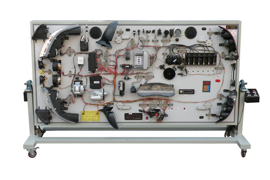 燈光系統(tǒng)、儀表系統(tǒng)、充電系統(tǒng)、起動系統(tǒng)、電動車窗系統(tǒng)、雨刮系統(tǒng)、中央繼電器保險絲盒、點火系統(tǒng)、發(fā)動機(jī)電控噴油系統(tǒng)、音響系統(tǒng)、發(fā)動機(jī)冷卻系統(tǒng)、OBDⅡ 電腦診斷座等,點火開關(guān)、測端子、智能故障設(shè)置盒總成、可移動臺架、使用說明書及實驗指導(dǎo)書等等。