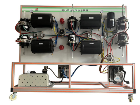1、臺架上具有的 全新東風天錦原車零部件有空氣壓縮機總成、空氣干燥劑、前橋儲氣筒、后橋儲氣筒、手制動儲氣筒、再生儲氣筒、輔助儲氣筒、四回路保護閥、制動腳閥、駐車閥、繼動閥、制動管路、氣壓表若干個。