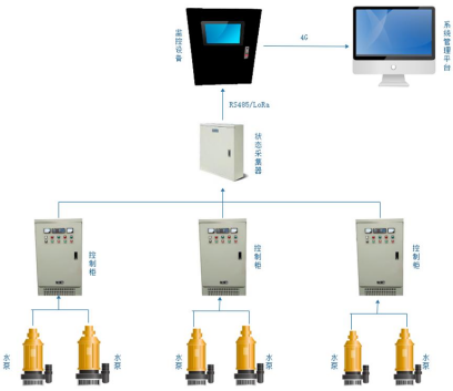 消防水泵監(jiān)測系統(tǒng)由采集器及監(jiān)測器兩部分組成,采集器通過 RS485 將采集到的信號傳輸?shù)奖O(jiān)測器,監(jiān)測器進(jìn)行本地顯示并將數(shù)據(jù)通過 4G 傳輸?shù)皆破脚_,系統(tǒng)架構(gòu)圖如下。