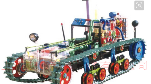 有機玻璃1:1比例制作東方紅75型鏈帶式拖拉機,各部件不同顏色表示。