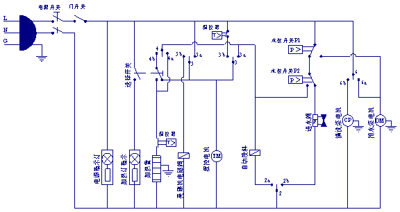 上圖為家用全自動洗碗機電氣原理圖。其工作過程是依靠水的壓力、溫度以及洗滌消毒劑的作用,并輔以程序控制電路,通過旋轉(zhuǎn)噴臂將水從不同的角度噴射到餐具上,實現(xiàn)對餐具的清洗、消毒和烘干。