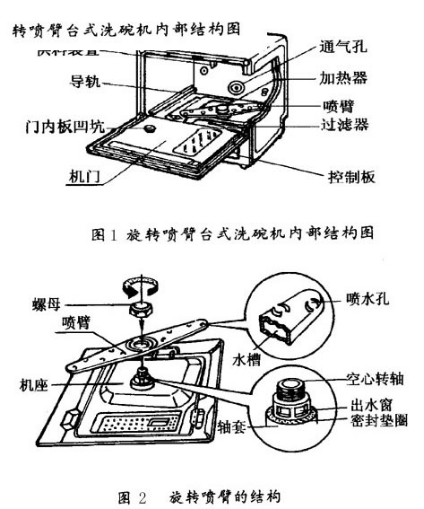 本洗碗機分為:預(yù)洗、強洗、正常洗、短時洗、干燥。除預(yù)洗外在每個過程都有進水、洗滌、排水過程。它采用旋轉(zhuǎn)噴臂式。洗滌裝置由旋轉(zhuǎn)噴臂、進水電磁閥、清洗泵(電機)、排水泵電機以及高低水位控制器等構(gòu)成。其中清洗泵和旋轉(zhuǎn)噴臂是洗滌裝置的核心部件。清洗泵安裝在機座底部,由單相電容起動式電機與葉輪泵組成。電機直接驅(qū)動葉輪泵,把水進行加壓,然后通過噴臂的噴水孔噴出。噴臂被安裝在機座上面,噴臂內(nèi)設(shè)有貯水槽,槽面上共設(shè)有7互成一定角度的錐形噴水孔,一端為4個,另一端為3,,水被清洗泵加壓后從噴臂噴出,由于噴臂受到水的反力矩的作用,使噴臂連同軸套一起統(tǒng)空心軸轉(zhuǎn)動,噴臂便從三維方向噴出具有一定壓力的水流對餐具進行噴射沖洗。洗滌結(jié)束后污水經(jīng)過濾器后由排水泵排出機外。