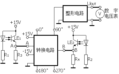 2、圖17-2為測速裝置示意圖,其中微型電動機帶動轉(zhuǎn)盤在兩個成90度的光繼續(xù)器的開口中轉(zhuǎn)動,轉(zhuǎn)盤上一半為黑色,另一半透明,轉(zhuǎn)動時,兩個光繼續(xù)器將輸出不同相位的方波信號,這兩個方波信號經(jīng)過轉(zhuǎn)換電路中的四個運放器,可輸出相位差分別為0°、90°、180°、270°的方波信號,它們的頻率都是相同的,其中任意一個方波信號均可輸出至頻率表顯示頻率。原理如圖17-3所示。