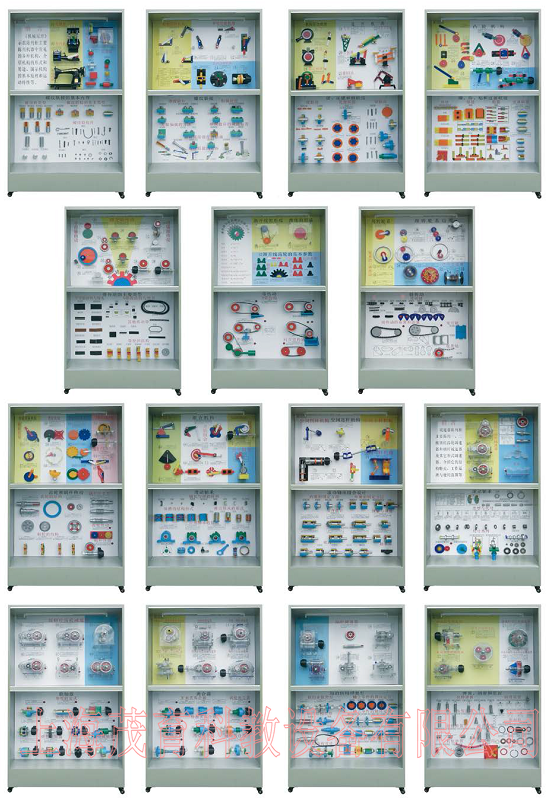 | 第八柜 間歇運動機構 | 齒式棘輪機構2件、摩擦式棘輪機構、外嚙合槽輪機構,內槽輪機構,球面槽輪機構、漸開線不完全齒輪機構、擺線針輪不完全輪機構(2件)、凸輪式間歇機構2件、停歇連桿機構、停歇導桿機構 |