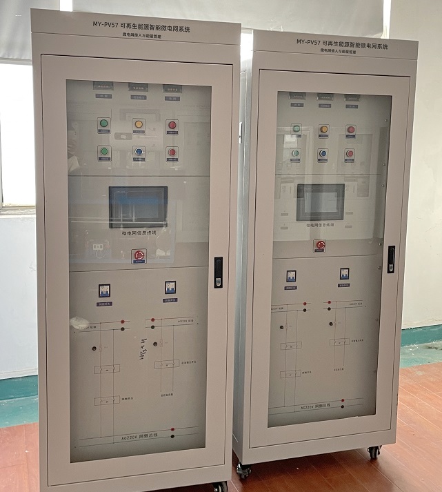 可再生能源智能微電網(wǎng)系統(tǒng)由能量調(diào)度控制器、浪涌保護器、交流接觸器、斷路器、單相計量儀表、電流互感器、工業(yè)觸摸屏(HMI)、測試端子等組成。主要完成微電網(wǎng)與電網(wǎng)能量交互的控制、計量與保護,同時通過能量調(diào)度控制器對儲能、分布式電源、交直流負荷等進行能量管理與調(diào)度,實現(xiàn)微電網(wǎng)平滑穩(wěn)定、經(jīng)濟高效運行。