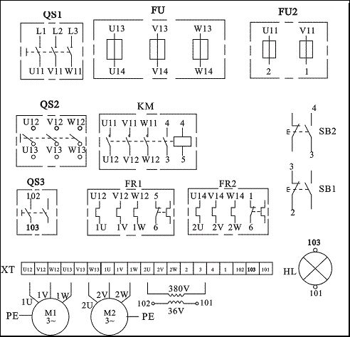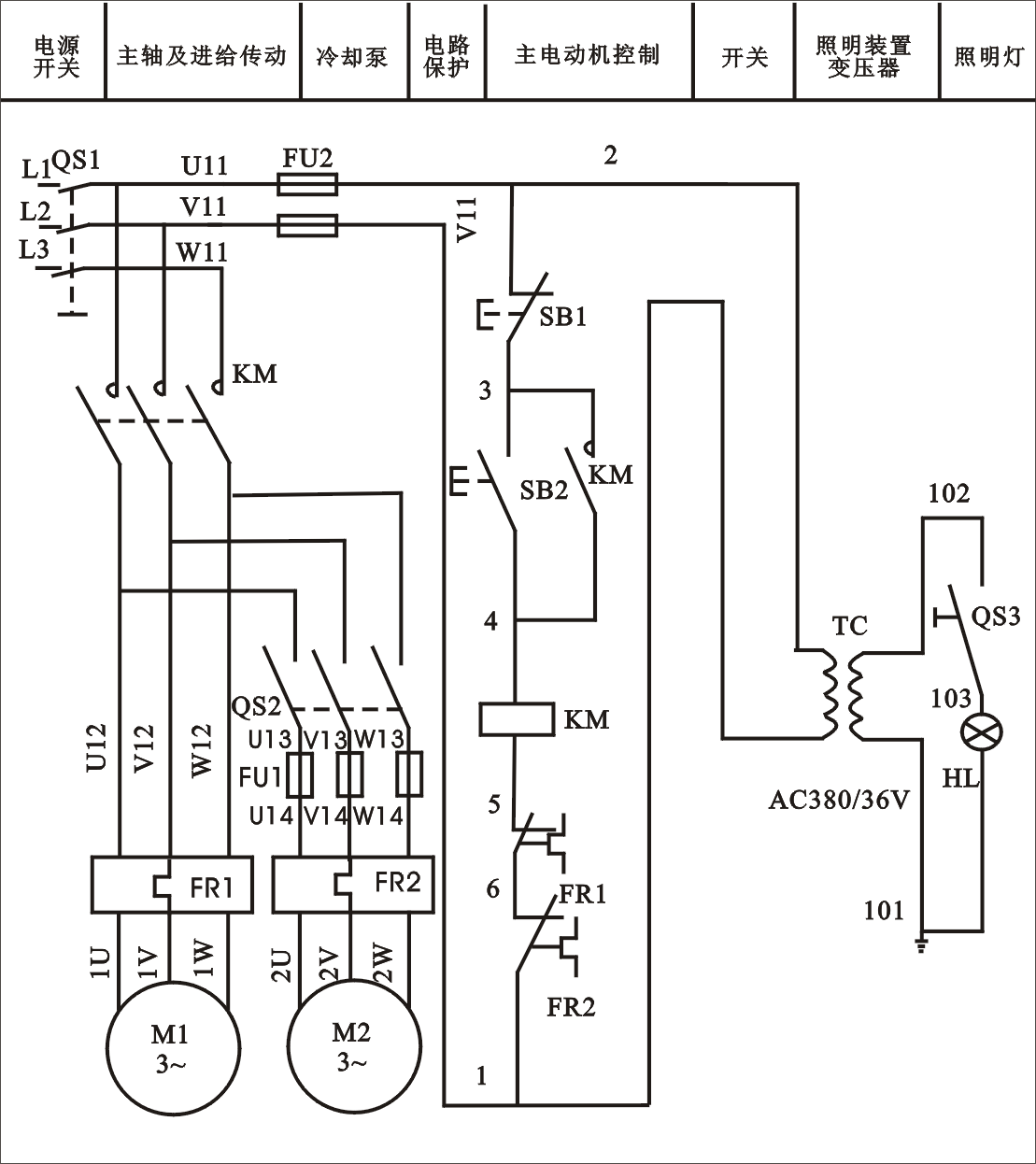 接觸器KM的線圈通電而鐵心吸合,主回路中接觸器KM的三個常開觸頭合上,主電機M1得到三相交流電而起動運轉(zhuǎn),同時接觸器KM的常開輔助觸頭也合上,對控制回路進行自鎖,保證起動按鈕SB2松開時,接觸器KM的線圈 仍然通電。若加工時需要冷卻,則撥動開關(guān)QS2,讓冷卻泵電動機M2通電運轉(zhuǎn),帶動冷卻泵供應(yīng)冷卻液。