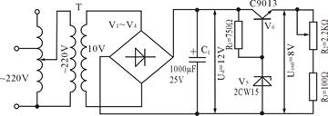 3) 輸出電壓低于8V但能穩(wěn)壓。此故障是錯用了穩(wěn)定電壓值低于8V的穩(wěn)壓管所致。更換穩(wěn)壓管即可排除。
