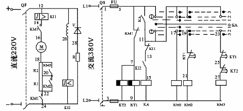 4)保護(hù)。電動機(jī)發(fā)生過載或短路時,主回路過電流繼電器KI1即動作,它切斷KA的通電回路,于是KM1、KM2、KM3均斷電,使電動機(jī)脫離電源。