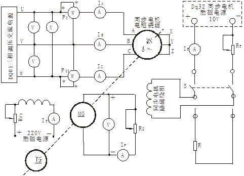 (3) 將控制屏左側(cè)調(diào)壓器旋鈕向逆時針方向旋轉(zhuǎn)至零位。接通電源總開關,并按下“啟動”按鈕。調(diào)節(jié)DQ32同步電機勵磁電源調(diào)壓旋鈕及R