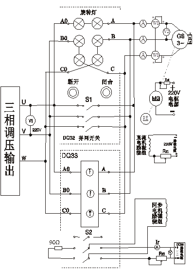 (5) 當發(fā)電機和電網相序相同時,調節(jié)同步發(fā)電機勵磁使同步發(fā)電機電壓和電網(電源)電壓相同。再進一步細調原動機轉速。使各相燈光緩慢地輪流旋轉發(fā)亮,此時接通DQ33整步表上S1開關,觀察DQ33上V表和H