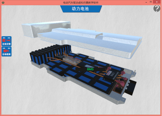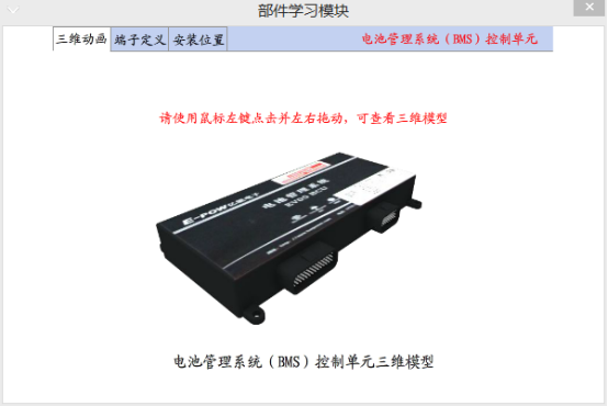 結(jié)構(gòu)認(rèn)知功能:三維模型對動力電池系統(tǒng)的每個零部件(包括:動力電池組總成、BMS、電池包、電池上殼體)等部件進行專業(yè)術(shù)語標(biāo)識,可任意控制虛擬現(xiàn)實3D仿真系統(tǒng)中虛擬攝像機,對任意視角的控制------觀察物體局部、拉近、圍繞物體旋轉(zhuǎn),可進行結(jié)構(gòu)認(rèn)知教學(xué)。