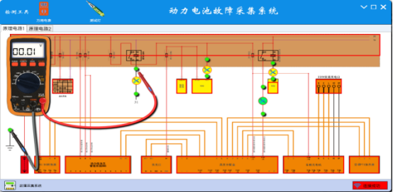 移動終端故障診斷:故障診斷頁面分布有工具欄,工具欄中的虛擬萬用表可對傳感器或執(zhí)行器線路中的檢測點進行實時測量,測量數(shù)據(jù)與實訓(xùn)臺同步。