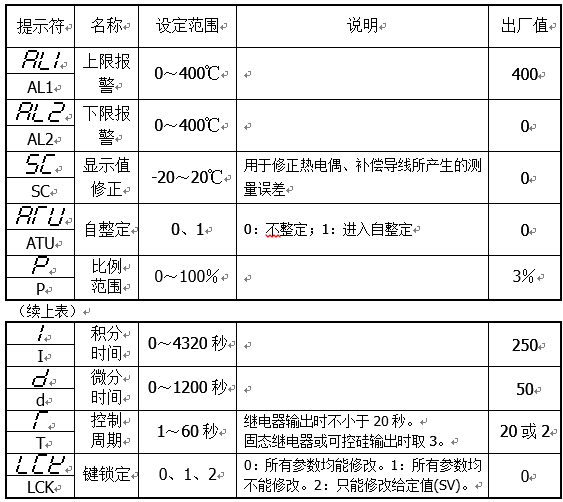 鍵,使SV窗口顯示為所需要的值。繼續(xù)按SET鍵,PV窗口依次顯示各參數(shù)的提示符,可以繼續(xù)設(shè)定其他的參數(shù),再按SET鍵5秒鐘以上,回到標(biāo)準(zhǔn)模式(無(wú)鍵按下30秒鐘后自動(dòng)返回到標(biāo)準(zhǔn)模式)。