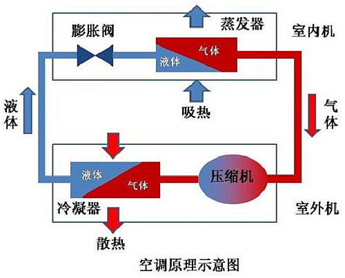液體氟利昂經(jīng)節(jié)流裝置減壓,進(jìn)入室內(nèi)機(jī)的換熱器(此時為蒸發(fā)器),蒸發(fā)氣化吸熱,成為氣體,同時吸取室內(nèi)空氣的熱量,從而達(dá)到降低室內(nèi)溫度的目的。成為氣體的氟利昂再次進(jìn)入壓縮機(jī)開始下一個循環(huán)。