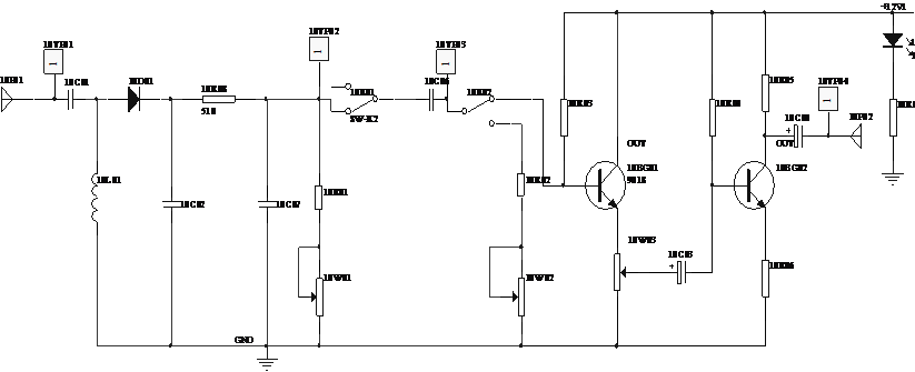 。在解調(diào)信號(hào)不失真的情況下,將10K02撥至右側(cè),示波器CH2接10TP04,可觀察到放大后音頻信號(hào),調(diào)節(jié)10W03音頻幅度會(huì)發(fā)生變化。