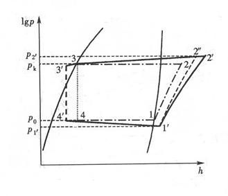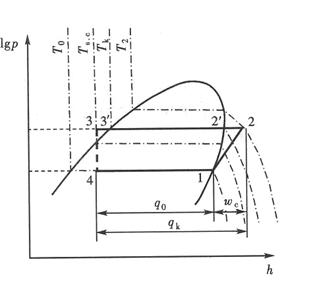 注:為理論循環(huán)的等熵壓縮過程:為實(shí)際循環(huán)的壓縮過程。
