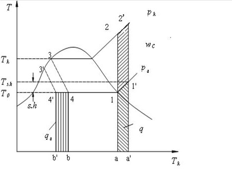 根據(jù)穩(wěn)定流動(dòng)連續(xù)定理,流經(jīng)回?zé)崞鞯囊簯B(tài)制冷劑和氣態(tài)制冷劑的質(zhì)量流量相等。因此,在對(duì)外無熱損失情況下,每公斤液態(tài)制冷劑放出的熱量應(yīng)等于每公斤氣態(tài)制冷劑吸收的熱量。也就是說,單位質(zhì)量制冷劑再冷卻所增加的制冷能力△q0(面積b'4'4bb')等于單位質(zhì)量氣體制冷劑所吸收的熱量△q(面積a11'a'a)。由于有了回?zé)崞,雖然單位質(zhì)量制冷能力有所增加,但是,壓縮機(jī)的耗功量也增加了△w0(面積11'2'21)。因此,回?zé)崾秸魵鈮嚎s制冷循環(huán)的理論制冷系數(shù)有可能提高,也有可能降低,應(yīng)具體分析。