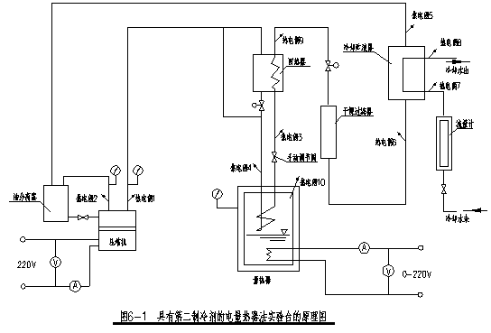 制冷壓縮機(jī)的制冷量的測(cè)試有幾種方法,其中采用具有第二制冷劑的電量熱器法是最精確的方法之一。具有第二制冷劑的電量熱器法實(shí)驗(yàn)臺(tái)的原理見圖6-1。