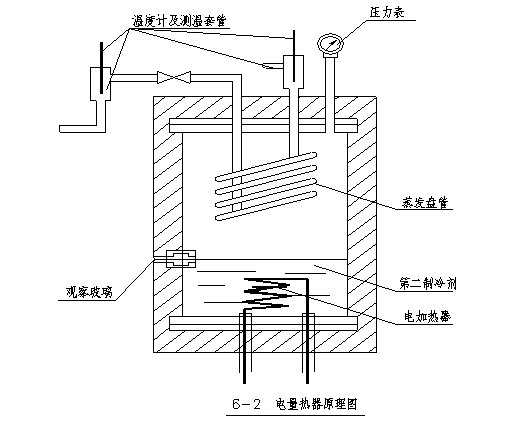 1.電量熱器法是間接測(cè)量壓縮機(jī)制冷量的一種裝置,它的基本原理是利用電加熱器發(fā)出的熱量來抵消壓縮機(jī)的制冷量,從而達(dá)到平衡。電量熱器是一個(gè)密閉容器,如圖6—2所示。電量熱器的頂部裝有蒸發(fā)器盤管,底部裝有電加熱器,浸沒于一種容易揮發(fā)的第二冷劑(常用R11、R12)中。試驗(yàn)時(shí),接通電加熱器,加熱第二制冷劑,使之蒸發(fā),第二制冷劑飽和蒸氣在頂部蒸發(fā)盤管被冷凝,又重新回到底部。而蒸發(fā)盤管中的低壓液態(tài)制冷劑被第二制冷劑蒸氣加熱而氣化,返回制冷壓縮機(jī)。實(shí)驗(yàn)儀在試驗(yàn)工況下達(dá)到穩(wěn)定運(yùn)行時(shí),供給電加熱器的電功率正好抵消制冷量,從而使第二制冷劑的壓力保持不變。