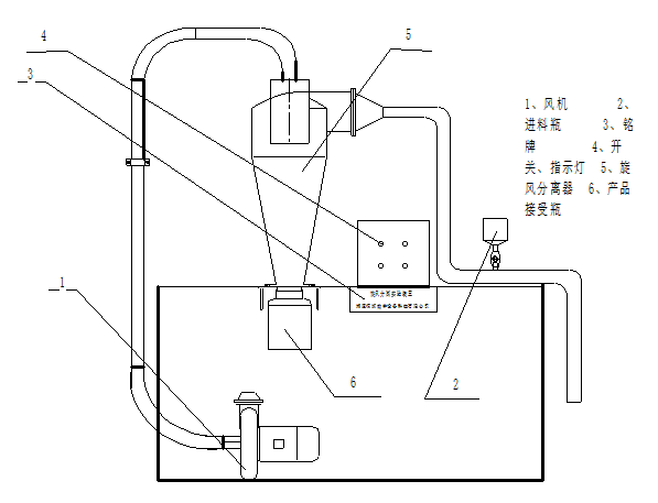 1.本實(shí)驗(yàn)裝置主要由風(fēng)機(jī)、粉塵加入瓶、旋風(fēng)分離器、產(chǎn)品接受瓶、開關(guān)、指示燈、控制屏等組成。
