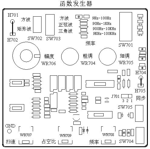 8.如果選擇矩形波,則調(diào)節(jié)WR708,可改變矩形波頻率,調(diào)節(jié)WR709時可改變占空比。改變SW704,可選擇矩形波的頻段,有二檔。