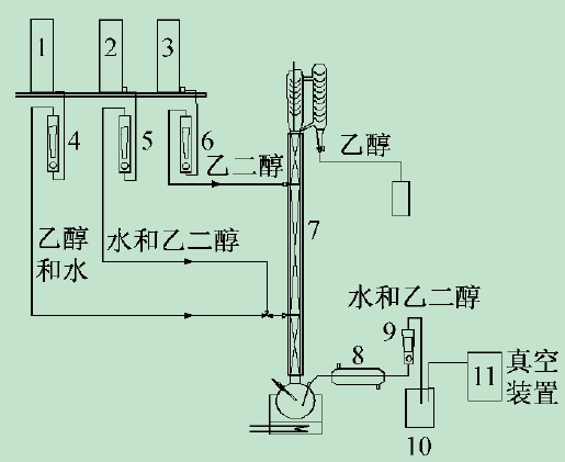 1,2,3-高位槽,4,5,6,9-轉(zhuǎn)子流量計(jì),7-三段式萃取精餾塔,8-冷卻器,10-產(chǎn)品罐,11-真空裝置