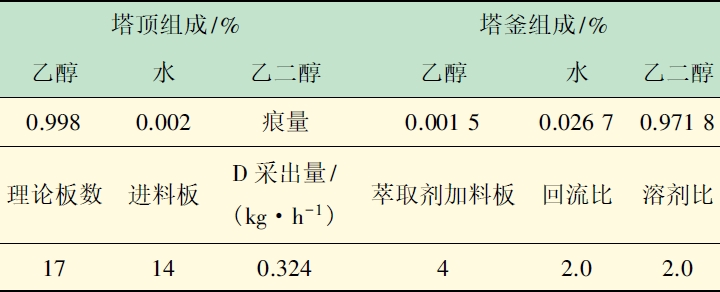 表3 乙醇水恒沸液萃取精餾過(guò)程中產(chǎn)品乙醇濃度由
