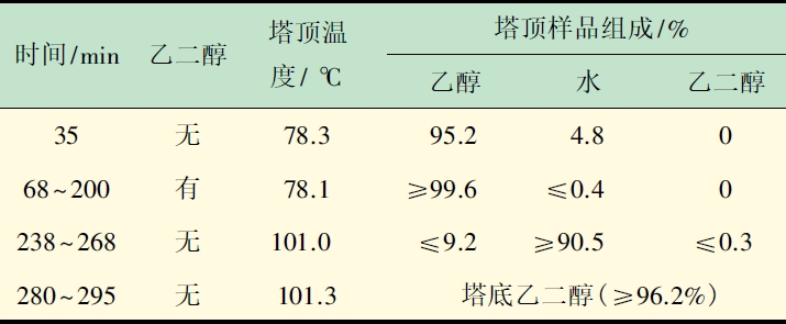 表2 萃取精餾分離乙醇水恒沸溶液實(shí)驗(yàn)檢測(cè)結(jié)果由表2 可知,實(shí)驗(yàn)35 min 時(shí),未加入萃取劑,全塔為全回流狀態(tài),塔頂產(chǎn)品組成與原料相似,為乙醇水的恒沸物,溫度為恒沸點(diǎn);加入乙二醇后,塔頂乙醇產(chǎn)品純度明顯提高,達(dá)到99.6%以上,塔頂溫度變化較小,此時(shí)為純乙醇沸點(diǎn),說(shuō)明萃取劑在精餾過(guò)程中起到了萃取精餾的作用。238 min 后,塔頂溫度快速升高到101.0 ℃,原料液已達(dá)警戒液位,停止進(jìn)料,塔頂產(chǎn)品分析表明乙醇已被完全萃取精餾分離,塔頂存在大量水,此時(shí)停止萃取劑進(jìn)料進(jìn)入溶劑回收階段。290 min后,塔頂分離物中乙二醇含量增加,停止精餾,塔底可獲得96.2%乙二醇循環(huán)使用。
