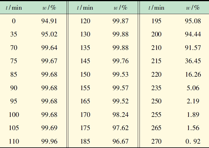 表3 可看出,乙二醇加入后,立即破壞乙醇水恒沸點(diǎn),塔頂乙醇由恒沸組成的95%迅速升至99.64%,110 min 時(shí),乙醇純度達(dá)到最高99.96%。在70 ~ 165min 內(nèi),萃取精餾均能獲得純度高于99%乙醇產(chǎn)品。170 min 時(shí)進(jìn)料停止,隨后乙醇被完全萃取分離,塔頂濃度急劇下降,水含量增加,至270 min 時(shí)乙醇含量?jī)H0.92%。塔頂溫度迅速升至水的沸點(diǎn),萃取塔分離乙二醇-水溶液,達(dá)到萃取劑回收階段。