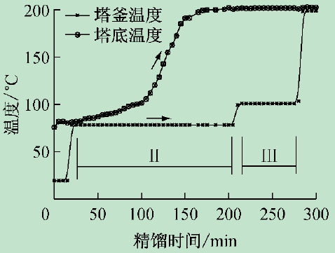 圖2 給出了塔釜和塔頂溫度變化曲線,塔釜溫度