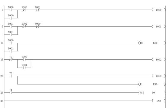 12 OUT T0 K80 15 LDI T0 16 LD Y000 17 OR Y001 18 ANB 19 OUT Y002 |