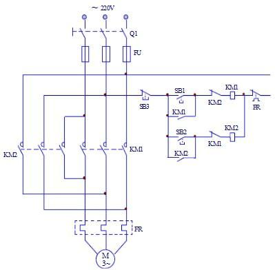 (3)按反向起動按鈕SB2,電動機(jī)反向起動,觀察電動機(jī)的轉(zhuǎn)向及接觸器的動作情況。按停止按鈕SB3,使電動機(jī)停轉(zhuǎn)。