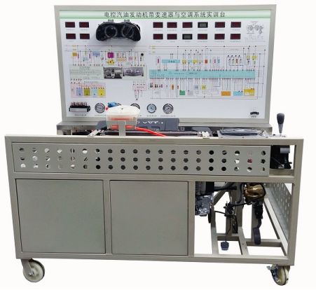 電控發(fā)動機帶自動變速器與空調(diào)綜合實訓(xùn)臺采用卡羅拉系統(tǒng)為基礎(chǔ),對發(fā)動機可進行起動、加速、減速等工況的實踐操作,對自動變速器可進行檔位顯示、空檔起動、前進檔及倒檔運行等工況實踐操作并做失速實驗、空調(diào)系統(tǒng)各項真實操作。可真實展示電控汽油發(fā)動機和自動變速器、空調(diào)系統(tǒng)組成結(jié)構(gòu)和工作過程。