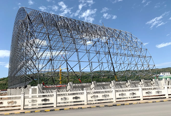 本工程網(wǎng)架總長度125m,跨度119m,水平投影總面積(軸線面積)14875㎡。網(wǎng)架結(jié)構(gòu)形式為正放四角錐螺栓球節(jié)點鋼網(wǎng)殼結(jié)構(gòu),下弦柱點支承,下部混凝土柱。網(wǎng)架結(jié)構(gòu)支座間距8m,網(wǎng)殼頂部標高46.51m。在1軸和17軸分別設有一道山墻。在網(wǎng)架下弦設有馬道。屋面圍護為單彩板,局部為采光板。